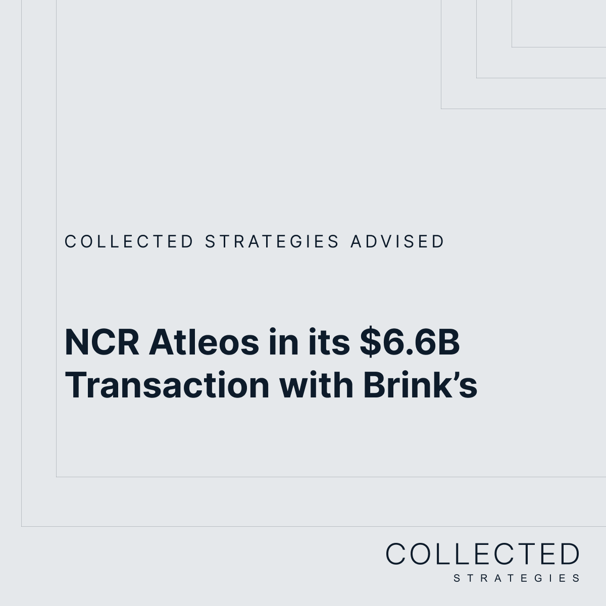 Collected Strategies advised NCR Atleos on its recently announced transaction with Brink's. The cash and stock transaction, which is valued at approximately $6.6B, will combine two leading financial technology infrastructure providers.
